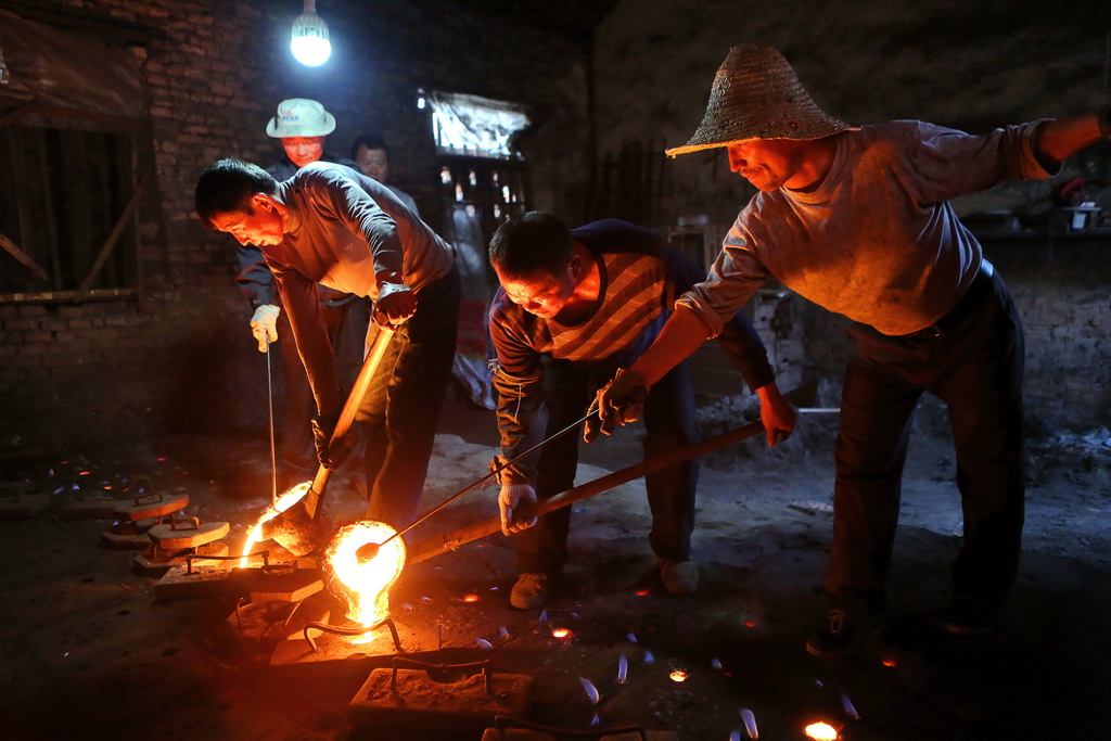 鐵花飛濺,鐵流滾滾的鑄造廠里,一股熱浪襲來,閃著千余度火焰的鐵水照紅了整個車間,工人們已經(jīng)在高溫下重復(fù)了持續(xù)幾個小時的工序,他們將土填入事先制作好的模具中并進行夯實,預(yù)留澆鑄口和通氣孔,再澆鑄。
